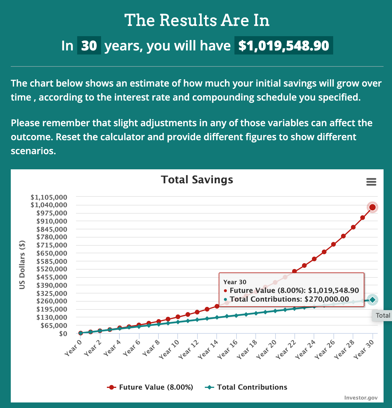 👈 Bump that up to investing $750 a month, and you’re looking at over $1 million over a 30 year period, even though you only contributed ~$270,000.